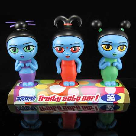 Created by Serenity Designer Geoffrey Mandel, the Fruity Oaty Girls Maquette Set includes the cheery trio of Fruity Oaty girls, display base and special Verse packaging. These hefty maquettes are cast in solid polystone resin and hand painted, with neck joints mounted on springs so they can move to the beat. Even the base – shaped and labeled just like a real Fruity Oaty Bar – is solid resin and color keyed, so girls can easily find their designated slots.